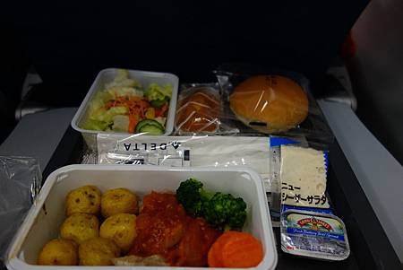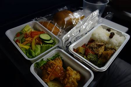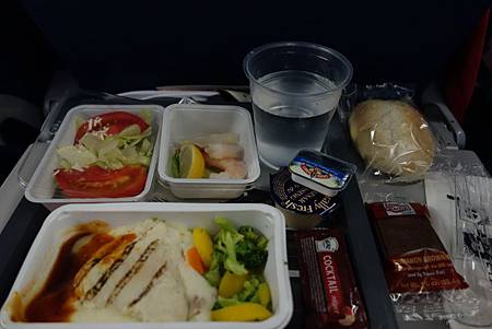 然後起飛沒多久就發晚餐啦,這個晚餐非常好吃,番茄雞肉+馬鈴薯,麵包還是一樣很乾。