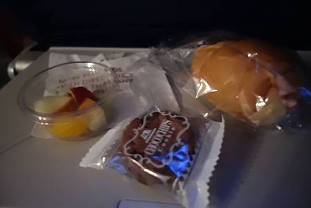 昏暗的氣氛下拿到了消夜小點心,這是明治的巧克力餅乾、一小盒水果和火腿起司麵包。