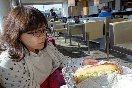 然後Chaba超機車,在飛機上說吃不下,到了機場又說他肚子餓,他買了一個雞肉潛艇堡來吃。