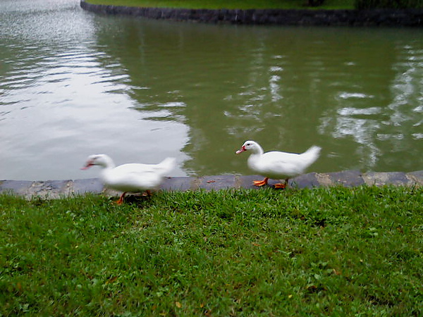 不過這兩隻呆鵝還是逃到湖裡去啦~(一邊逃,屁股還一邊搖晃)